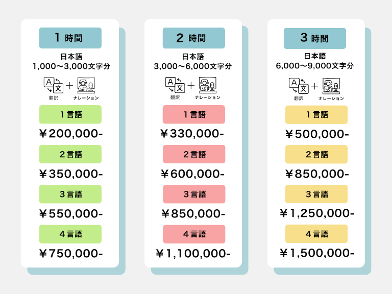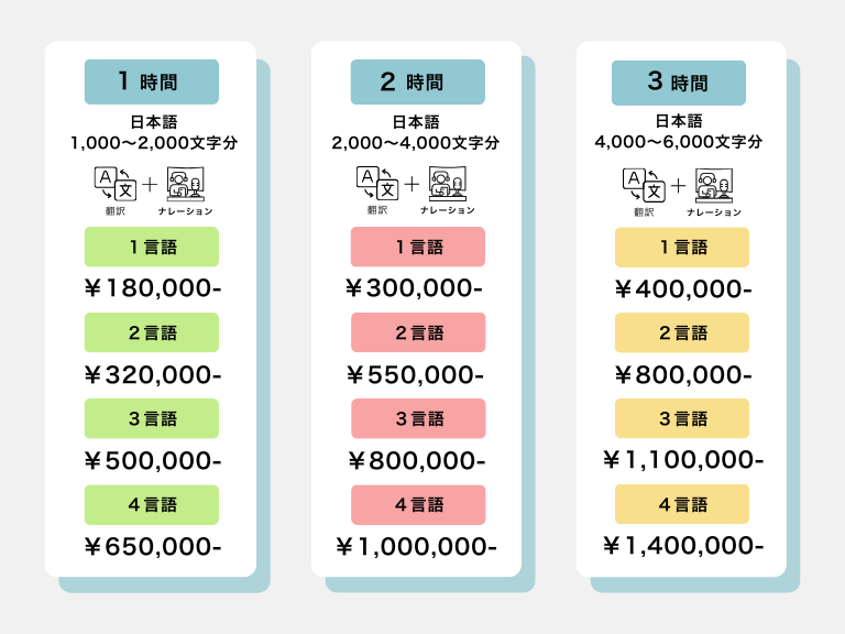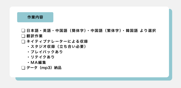 多言語音声ガイド「TAG」プラン(プレイバックなし)は、音声ナレーション収録時のプレイバックはありません。プレイバックがないため収録できる分量が多くなります。